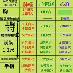 この3つの経絡は、手関節掌横紋~肘窩横紋または大陵穴~曲沢穴を1尺2寸として図ってから取穴していきます。